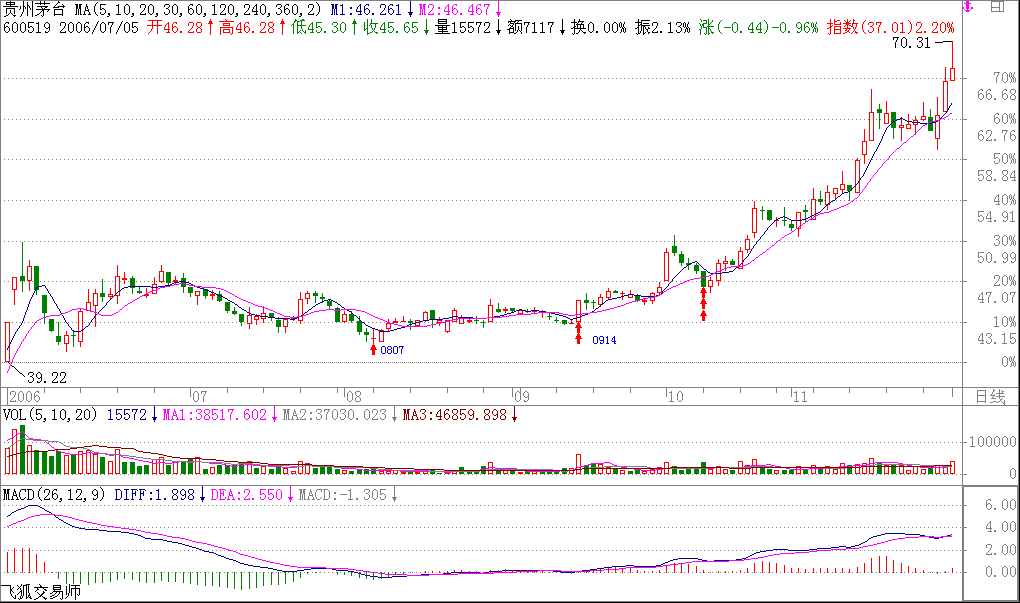 明白了這一點,任何不在這兩個買點買入的行為都是不可以原諒的,因為這是原則的錯誤,而不是高低的區(qū)別,如果你選擇了這個買賣系統(tǒng),就一定要按照這個原則了。買的方式明白了,賣就反過來就可以了,這是十分簡單的。一吻而消魂,學(xué)會這消魂之吻,就能在動蕩的市場中找到一個堅實的基礎(chǔ)。當(dāng)然,相應(yīng)的均線的參數(shù)可以根本資金量等情況給予調(diào)節(jié),資金量越大,參數(shù)也相應(yīng)越大,這要自己去好好摸索了。這點,對于短線依然有效,只是把日線改為分鐘線就可以了。而一旦買入,就一直持有等待第一個賣點,也就是女上位纏繞后出現(xiàn)背弛以及第二個賣點也就是變成男上位的第一個纏繞高點把東西賣了,這樣就完成一個完整的操作。