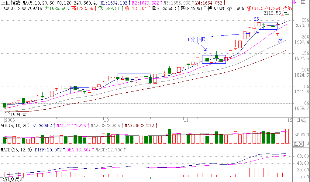 趨勢中第二個中樞開始,一般1分中樞以5日線為強支撐;5分中樞通常會破5日線,考驗10日線;30分中樞即日線筆中樞一般破34日線,考驗55日線,89日線有強支撐或壓力。具體考驗?zāi)臈l均線,與該中樞前的次級別有關(guān),如果前次級別有3個以上中樞,相應(yīng)考驗均線要后移,這與波浪理論中的回調(diào)幅度有一定關(guān)系。